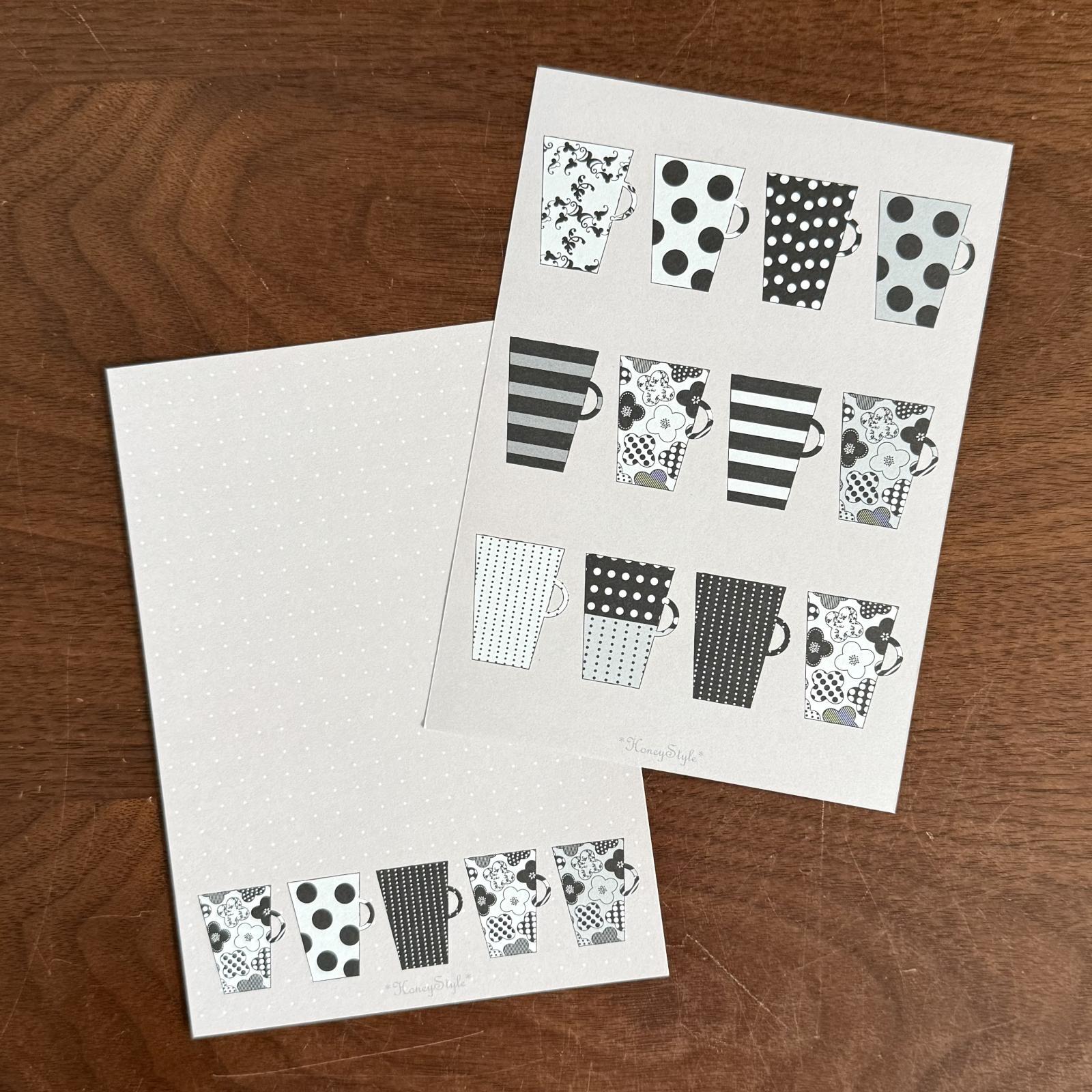 memo便せん(一筆せん): モノクロカップ柄 5枚入 【両面印刷:裏面は柄&ドット罫入】
